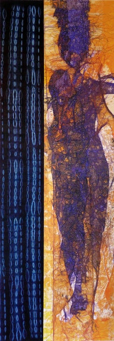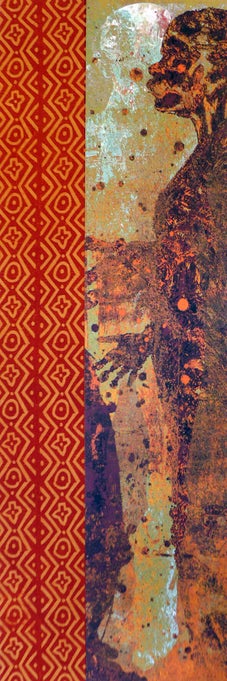 "Djinn", Mixed Media, Afrikanischer Stoff, Leinwand auf Holz, Lasurfarben, 50 x 150 cm